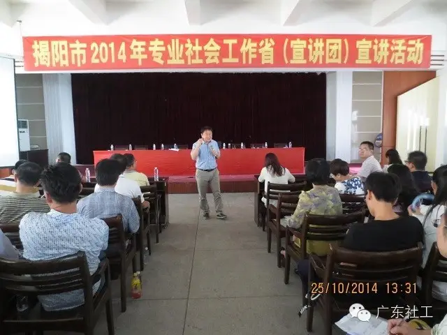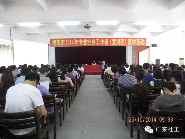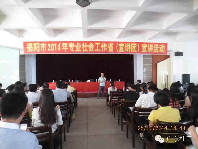 社工中国网消息:(通讯员:匡梦叶 李囿慧)10月25日,在广东省社会工作师联合会(以下简称“联合会”)组织下,由广东省社会工作师联合会副会长、广东工业大学副教授阎安、原广州市青年文化宫副主任、党总支副书记屠宪治、东莞市大众社会工作服务中心督导彭显荣、联合会党支部书记兼总务毛宇英、干事匡梦叶一行5人组成的宣讲团赴揭阳开展2014广东省粤东西北社会工作宣讲行动。揭阳市民政局副局长林小彭、有关科室干部、社工委徐锦泉主任、市辖属下的各区、县、镇的干部、以及揭阳职业技术学院社会工作专业师生共300多人参加了宣讲会。